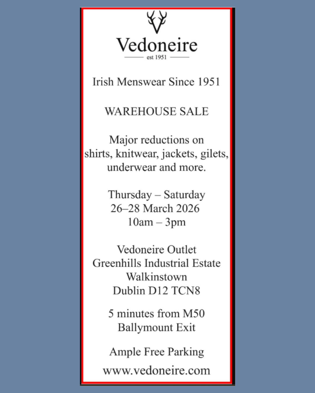 Located minutes from the M50 Ballymount exit the Vedoneire Outlet is a one stop location for all your clothing needs.